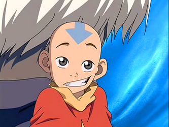 | Tytułowy bohater bajki, Aang - ostatni z Nomadów Wiatru. W tle fragment latającego bizona. (Tak. Latającego bizona). |